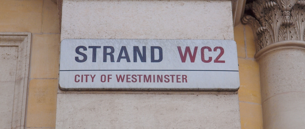 Die Strand Straße in London oder besser bekannt als The Strand ist eine geschichtsträchtige Verbindung zwischen dem historischen und wirtschaftlichen Zentrums von Greater London (City of London) und dem Stadtbezirk von London, der City of Westminster, der das westliche Stadtteilzentrum kreiert. Im Mittelalter waren diese beiden Standorte noch separate Siedlungen. Die Themse bildete bis zum 17. Jahrhundert den Mittelpunkt des Hauptverkehrs. Heutzutage startet die Strand Straße am Trafalgar Square und verläuft in östlicher Richtung bis an die Begrenzung der City of London, wo sie von der Fleet Street empfangen wird. Der Temple Bar, ein Grenzpunkt der im Westen die City of London an der Straße nach Westminster kennzeichnet, ist dort mit einer Säule in der Straßenmitte präsent und markiert an diesem Baustein die Abgrenzung der City of London.